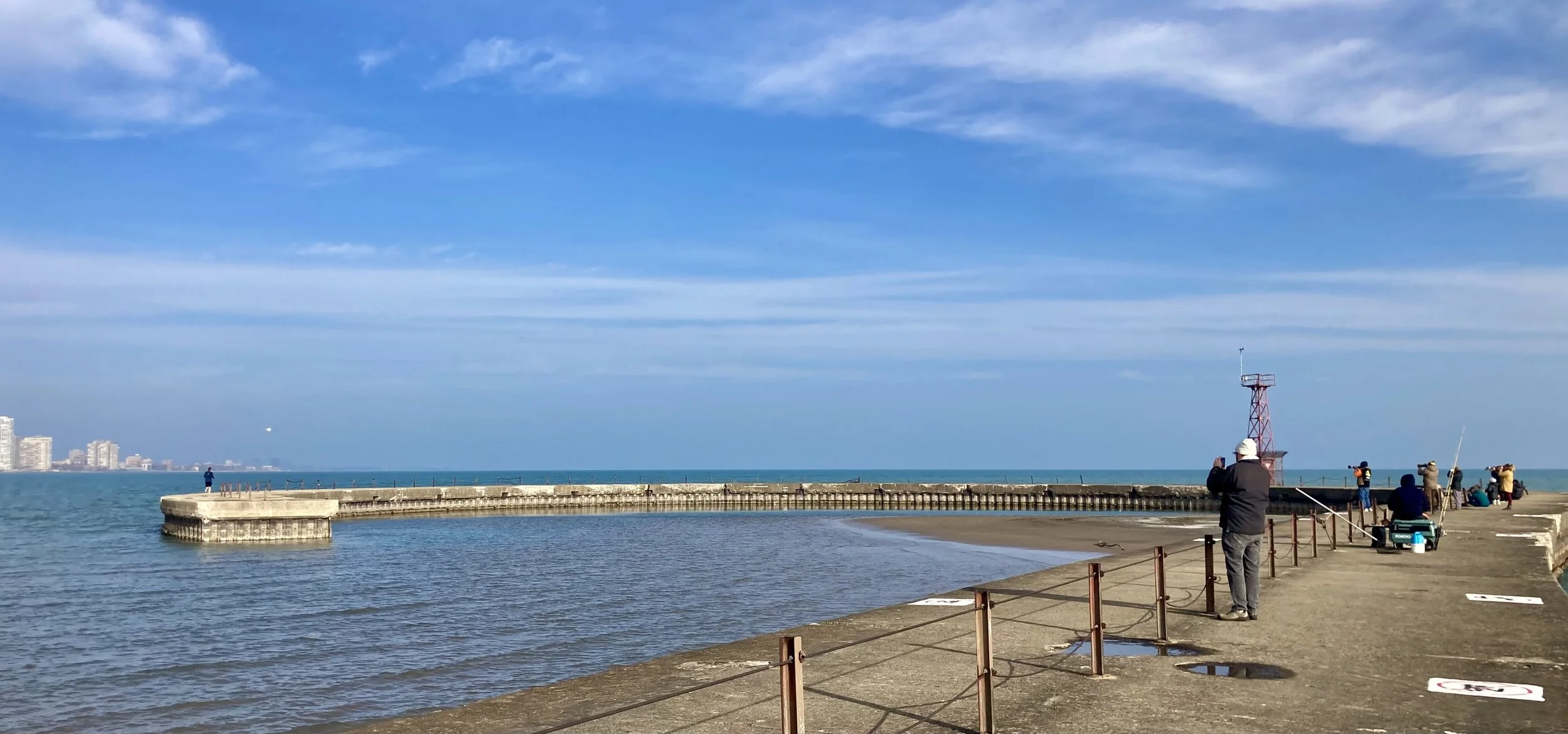 After I pass the dog beach I reach the bird sanctuary which sits adjacent to the water and is part sandy prairie and part wooded area. Not too large. A football field or two? I jog out on this 100 yard break wall/pier that juts straight out into the water and is shaped like a question mark. About 15 feet wide. It blocks the huge waves from the beach. As I get a few feet out on the breakwall I scan the water. I love it. Its color and the waves are never the same. Like days or emotions or children. Today the waves are choppy but not huge, and it’s the color of mint chocolate chip ice cream after it’s been melted and stirred together by a vigorous five year old.