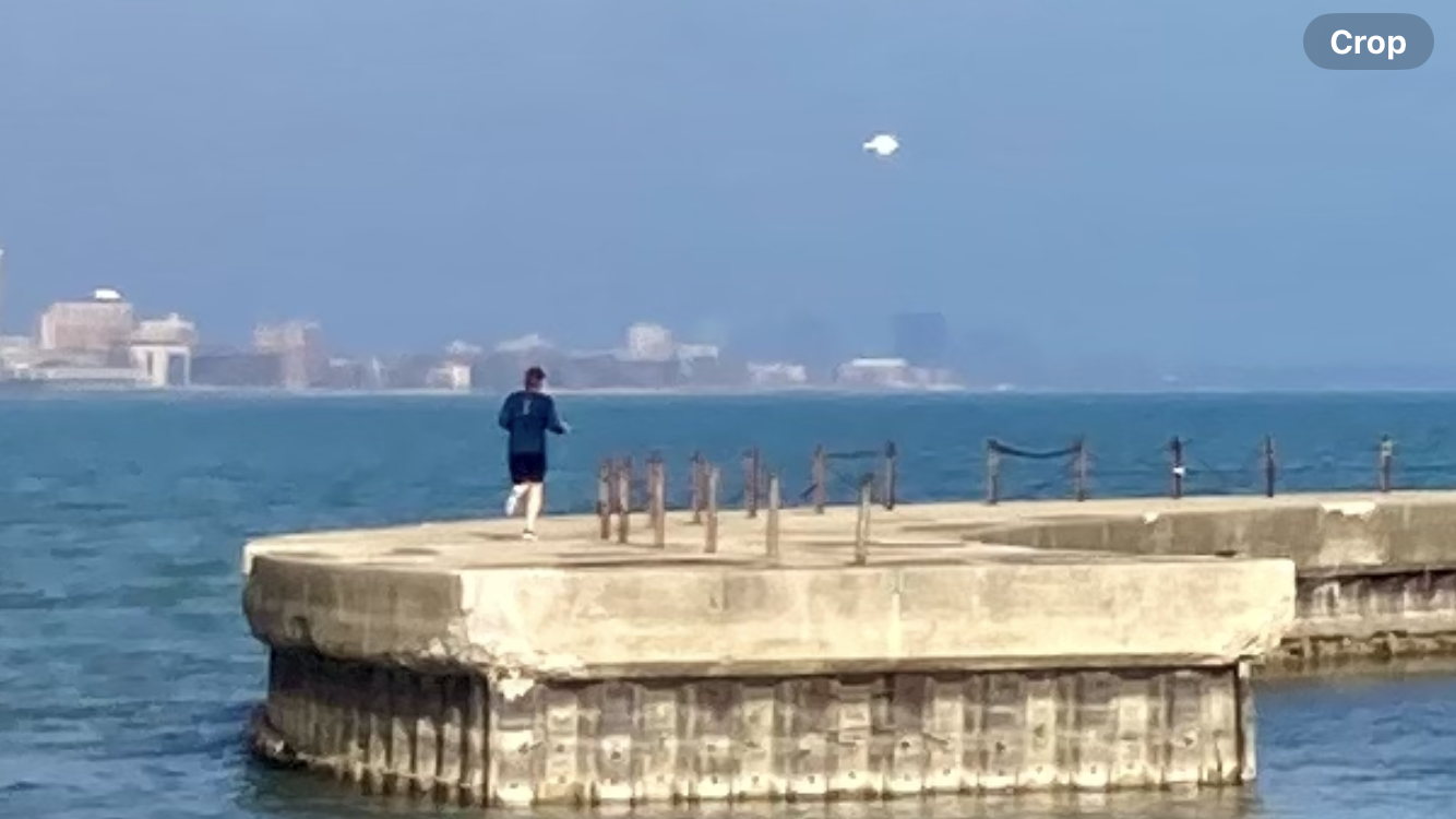 Spandex man at end of pier with tiny white dot/snowy owl flying AWAY.